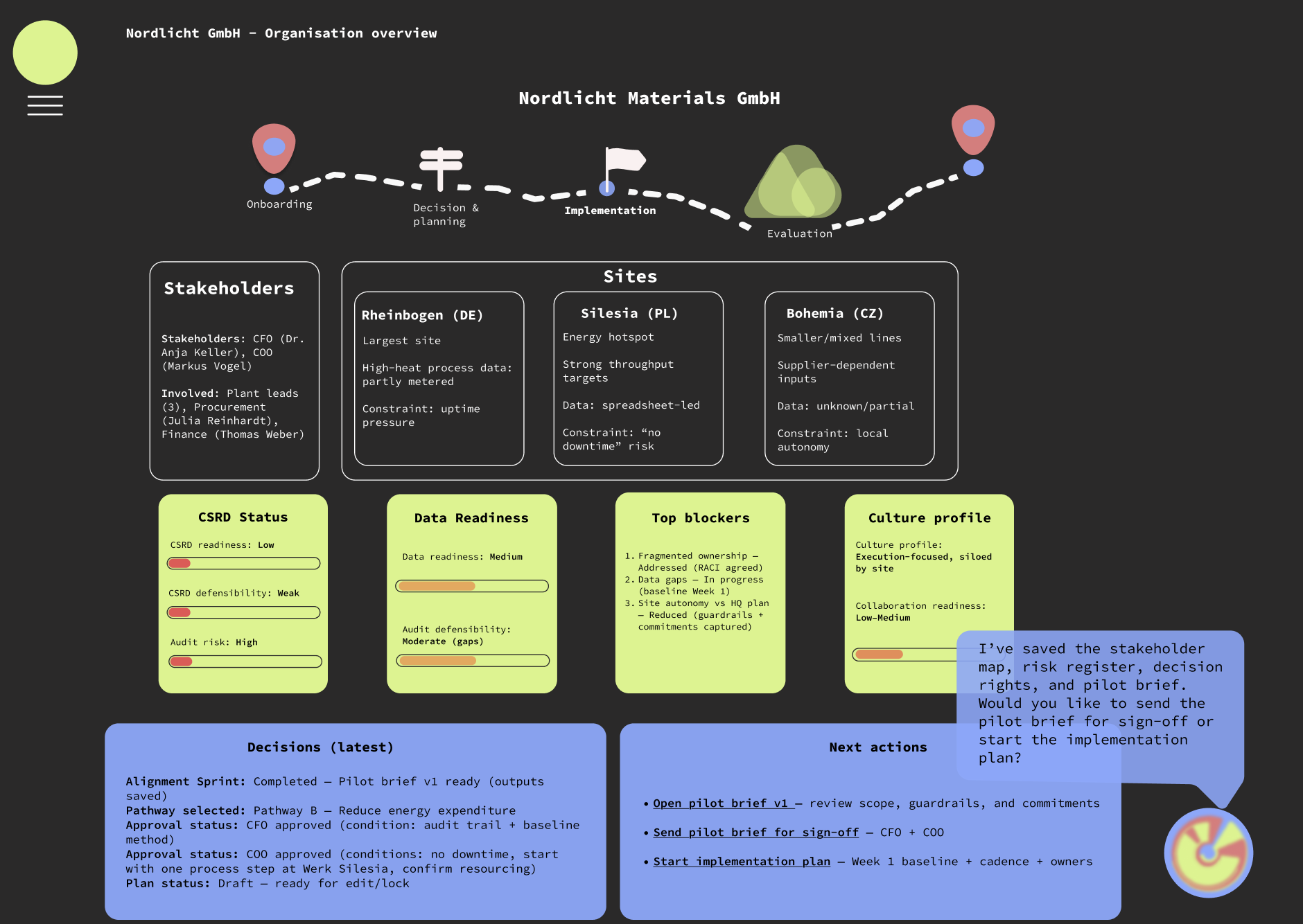 Bring goals, decisions, actions, and evidence into one workflow—reducing fragmentation, chasing, and the hidden admin cost of change.